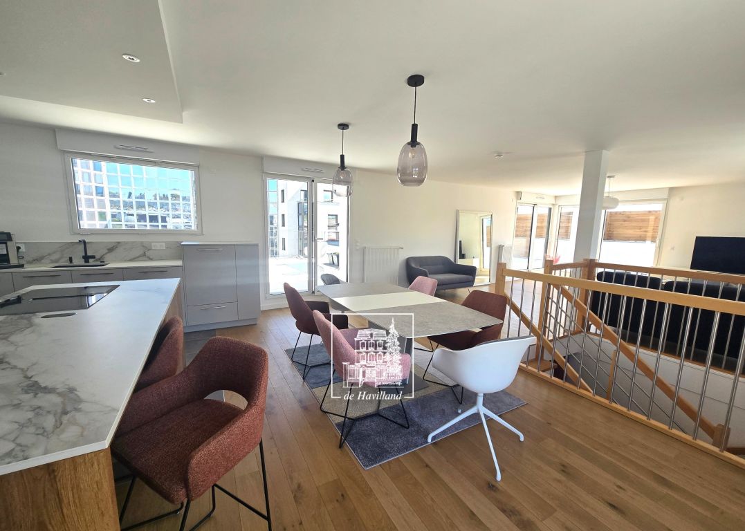 L'Agence Immobilière De Havilland vous présente : ROOFTOP. Immeuble construit en 2024. Superbe appartement en duplex avec prestations de grande qualité. Superbe séjour traversé de lumière entouré d'une grande et belle terrasse (117 m²) plein ciel, cuisine ouverte (très bien) équipée, quatre chambres dont suite parentale avec salle de douche (neuve), salle de bain et salle de douche impeccables. Deux emplacements de parking en sous-sol. Grand standing et beaux volumes pour cet appartement de toute beauté. LOYER CC = Charges de Copropriété comprises. Honoraires : Visite, constitution du dossier, rédaction du bail et d’état des lieux d’entrée pour : Une location en résidence principale (loi ALUR) : 11, 13 ou 15 €/m² selon communes. Une location en résidence secondaire, ou logement de fonction : 1 mois de loyer TTC. D.G : Meublé : 2 mois HC. Vide : 1 mois HC.